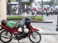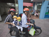 Streets are starting to change significantly when the wake-up alarms are done with ringing. Saigon population is going to work. Delivery scooters are slowly fading......Now, you can see totally different ''cargo'' on the same scooters. From kids, grownups, up to parents with kids and grandparents with grandchildren. Total chaos. Often, you can see this children sleeping. Specially during long long way back from Saigon downtown. Understandably, beside sleeping, you can find people doing various ''ACTIVITES'' while travelling on scooters – eating, learning...... They are really trying to use their time spent on overcrowded streets in overcrowded magalopolis.
