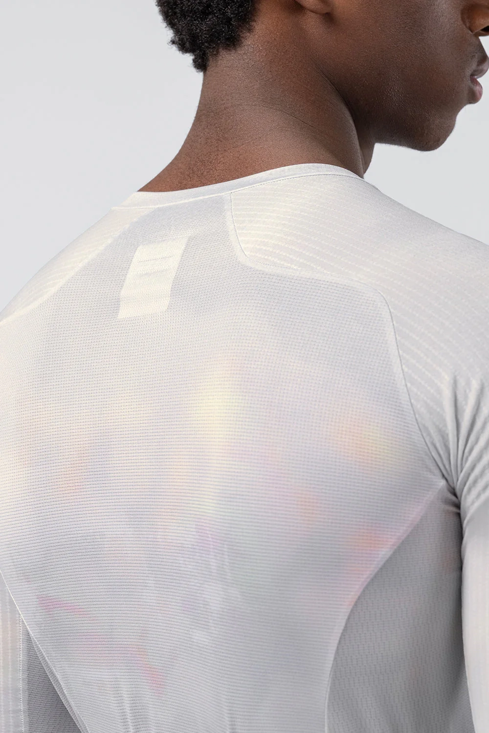 Textured fabrics have been used on the sleeves and back, selected for their ability to disperse airflow and improve aerodynamic behavior in motion. The seamless ergonomic sleeves ensure a precise fit to the shape of the arm, while their extended length further helps to reduce wind resistance.