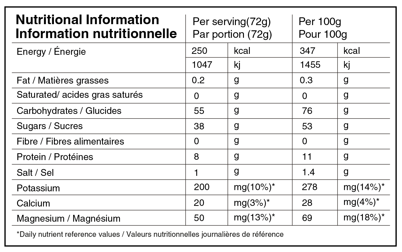 - 55g carbohydrates: simple and complex natural carbohydrates
