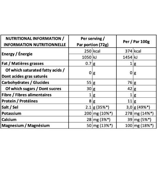 Sugars (dextrose, maltodextrin), hydrolyzed oat flour (gluten-free), pea protein isolate, barley rice protein, yeast extract, salt, carrot powder, tomato powder, leek powder, natural flavours, herbs & spices (bayleaf, celery, tyme), magnesium citrate, potassium citrate.