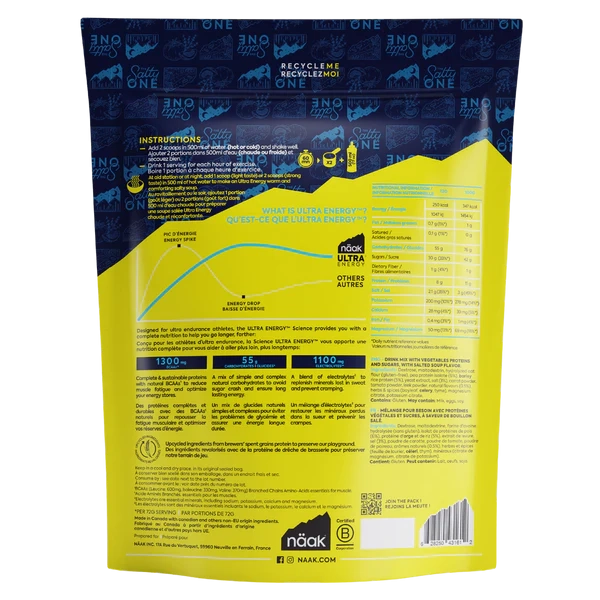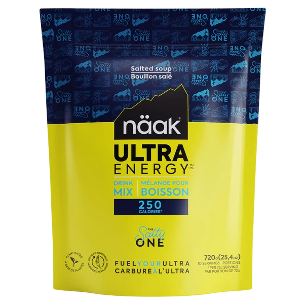 Fuel your ultra distance on liquid energy. Näak Ultra Energy™ Drink Mix provides 250 calories per 500ml of water. Fast-acting and easy to ingest, it provides all the nutrients you need to race an ultra. The Ultra Energy™ Drink Mix Salted Soup recipe is made with salty vegetable broth flavor and upcycled ingredients and can be used either hot or cold. The resealable zipper allows tailored consumption and refills from the Salted Soup bulk bag for on-the-go use. A 720g bag will make a total of 10 portions of 500ml or 5L of drink mix.