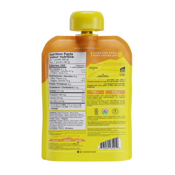 Sweet potatoes*(46%), Maple syrup*(13%), Hydrolysed Oat Flour*, Water, Canola Oil*, Butternut Squash*(6%), Pea Protein*, Barley Rice Protein (2%), Citric Acid, Sea Salt, Natural Antioxydant (mixed tocopherols). Contains: Gluten.