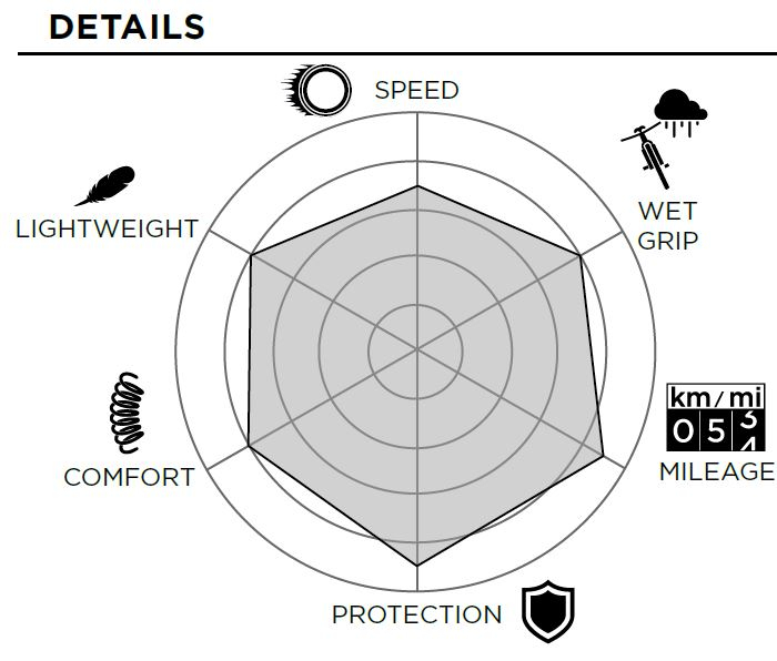 The EVOCompound includes all those technical characteristics needed for an all-round performance: Excellent rolling resistance and grip, good adhesion and long durability. As a result of the combination of these properties, the EVO compound has been optimized so to have the most balanced behavior for the rider.