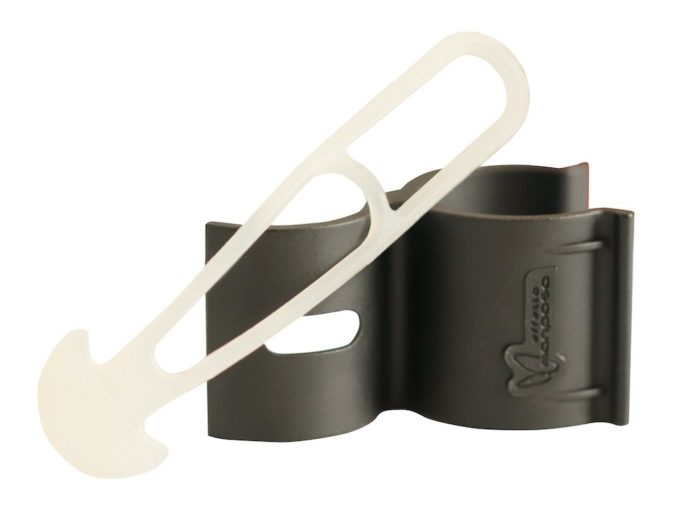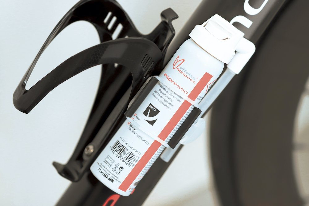 Espresso osfa Clip can accommodate different sizes of cartridges. This holder allows to attach one Espresso (75 ml) or Espresso Doppio (125 ml) next to the bottle cage. Thanks to its flexibility, the end of the Clip below the bottle cage easily conforms to the profile of the down tube, simply by tightening the screw of the bottle cage