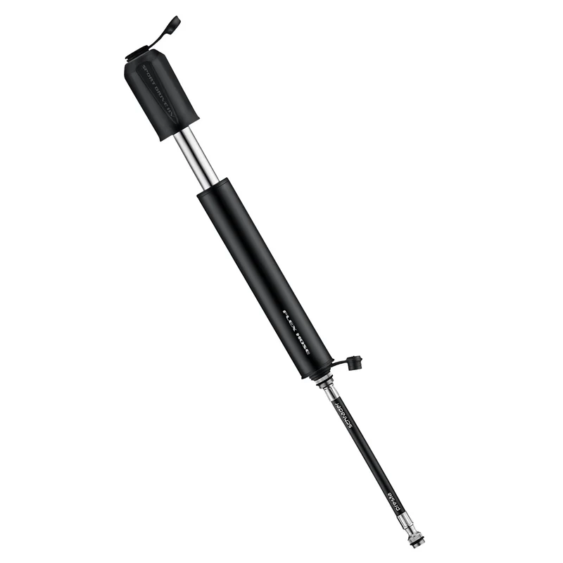 It features a machined-aluminum barrel and piston as well as a Composite Matrix handle and end caps. The pump comes equipped with our Presta/Schrader compatible Flex Hose.