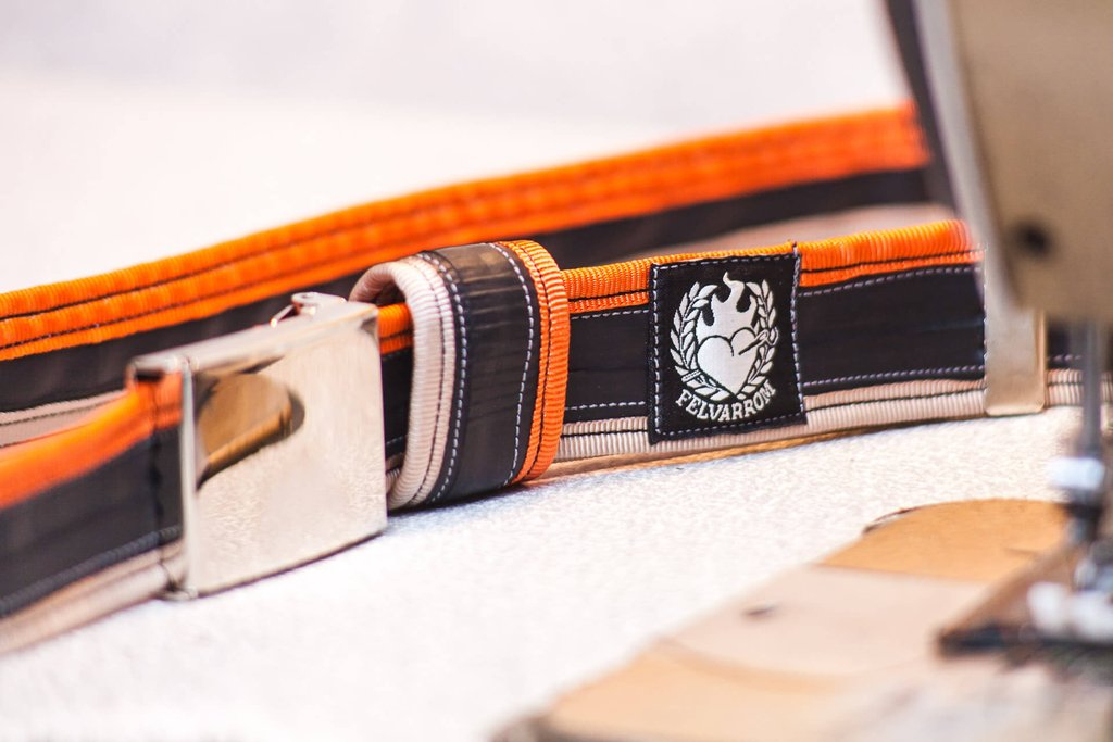 Save the nature! Belt made of carefully selected, high-quality, recycled tubes, with multicolored canvas strips sewn on the side. Each strap has a bike patch on the surface, created in the past life of that tube, so that makes it different and unique. In addition to exceptional durability, these belts are very soft and do not stretch. All the tubes that are collected are thoroughly cleaned, so you don’t have to worry that this strap will leave stains on your pants. The strong flip-top metal clasp is adjustable, does not need holes and does not damage the inner tube surface.