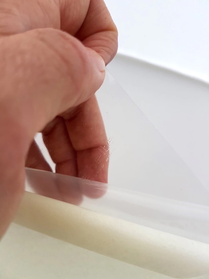 3. Make sure the element fits the area you want to protect and make sure your hands are clean. After that, completely remove the backing paper, freeing the adhesive surface (try not to touch the adhesive surface with your fingers, or do it as little as possible: being transparent, fingerprints might show);