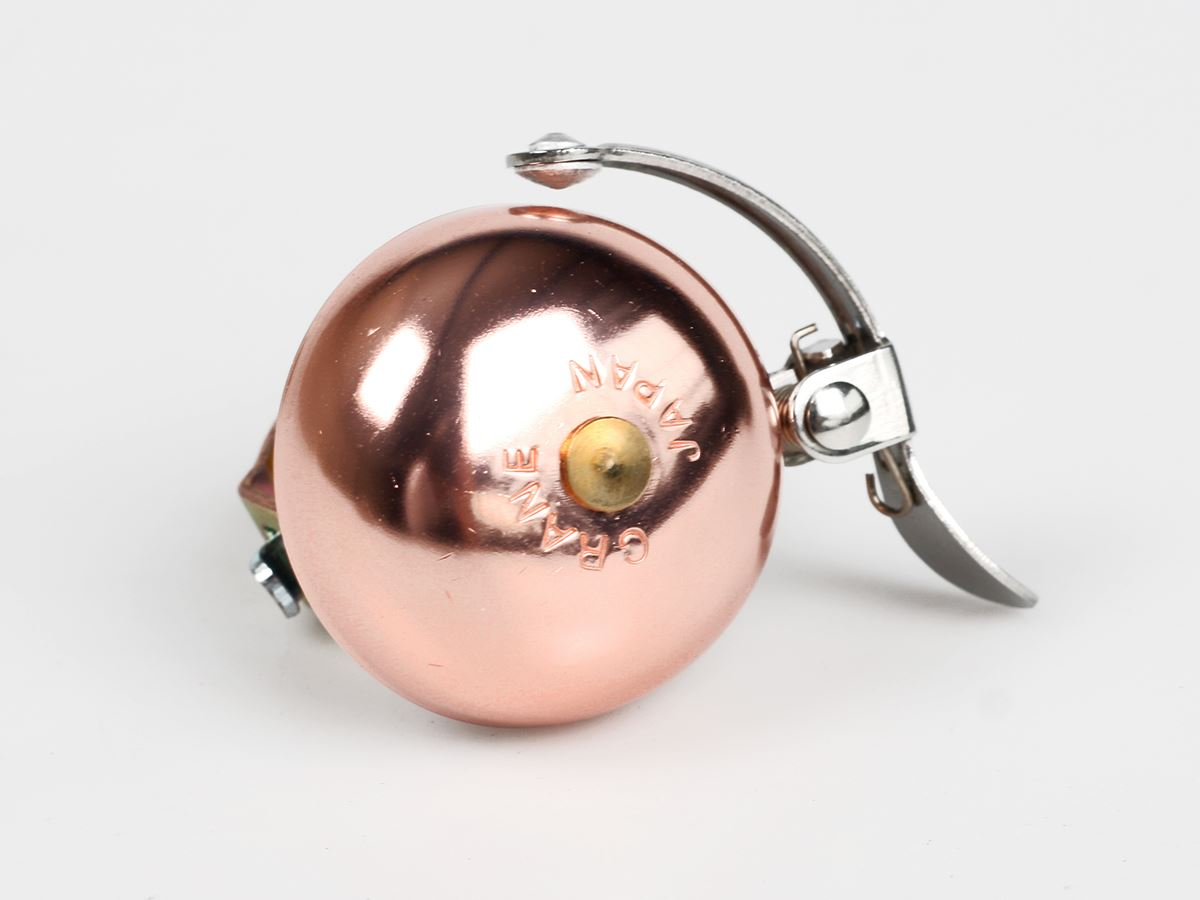 Crane bells are made in Osaka, Japan. These traditional designs (copper) are timeless and have beautiful clear ring tones. This is the small size bell from Crane, designed to fit pretty much any handlebar, that is plenty loud – 50% louder than the little brass bells that aren’t quite loud enough, and louder even than your typical “ding-ding” bells. Every bike should have one.