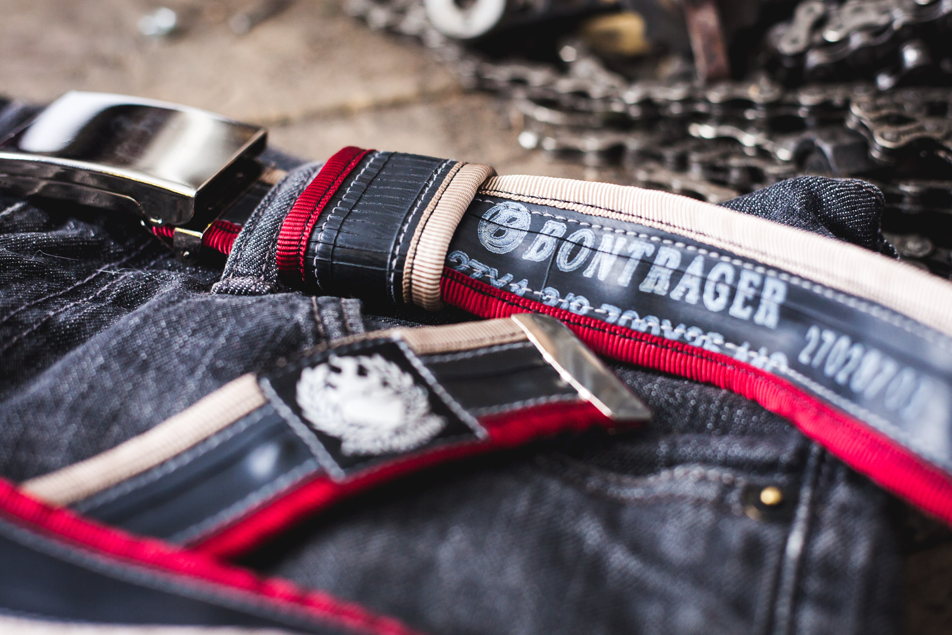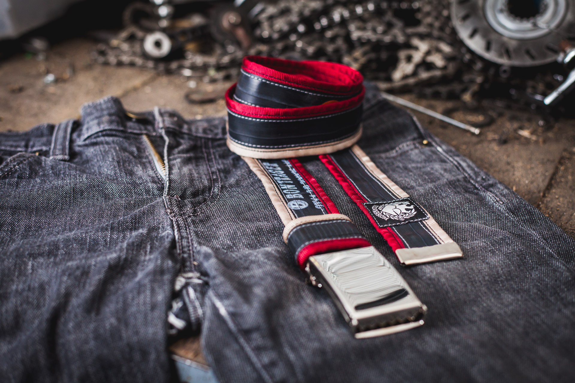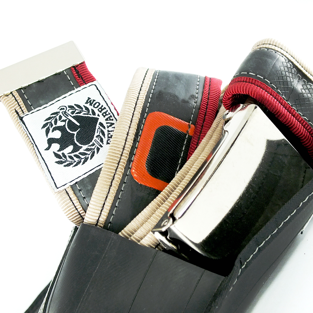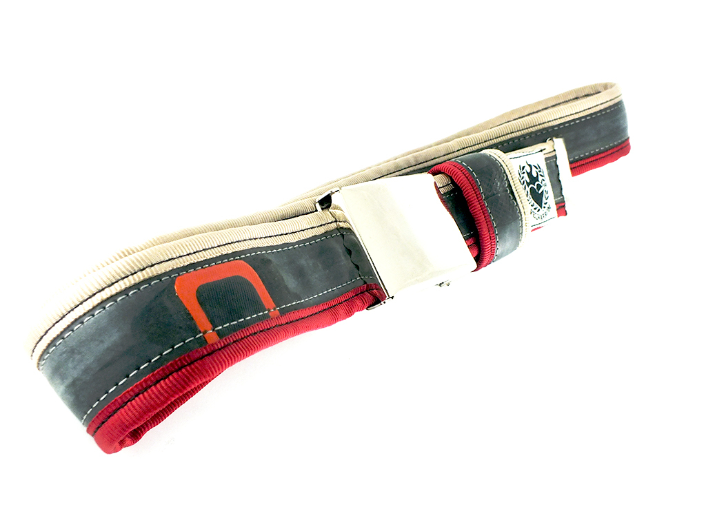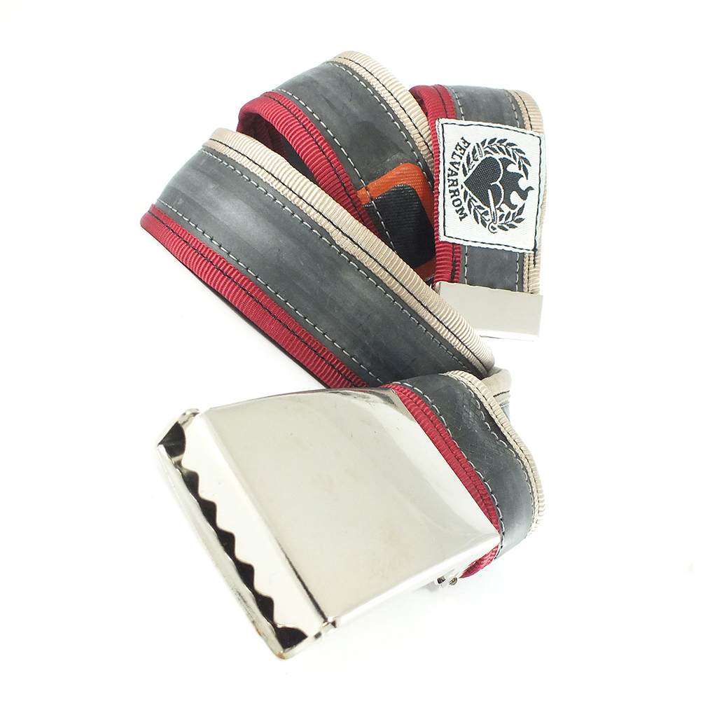 Čuvajte prirodu! Remen izrađen od pomno odabranih, visokokvalitetnih, recikliranih zračnica, s raznobojnim platnenim trakama sašivenim sa strane. Svaki remen ima biciklističku zakrpu na površini, nastalu u prošlom životu te zračnice, pa ga to čini različitim i jedinstvenim. Pored iznimne izdržljivosti, ovi pojasevi vrlo su mekani i ne rastežu se. Sve zračnice koje su prikupljene detaljno se čiste, pa ne morate brinuti da će vam ovaj remen obojiti hlače. Snažna flip-top metalna kopča je podesiva, ne treba rupe te ne oštećuje površinu zračnice.