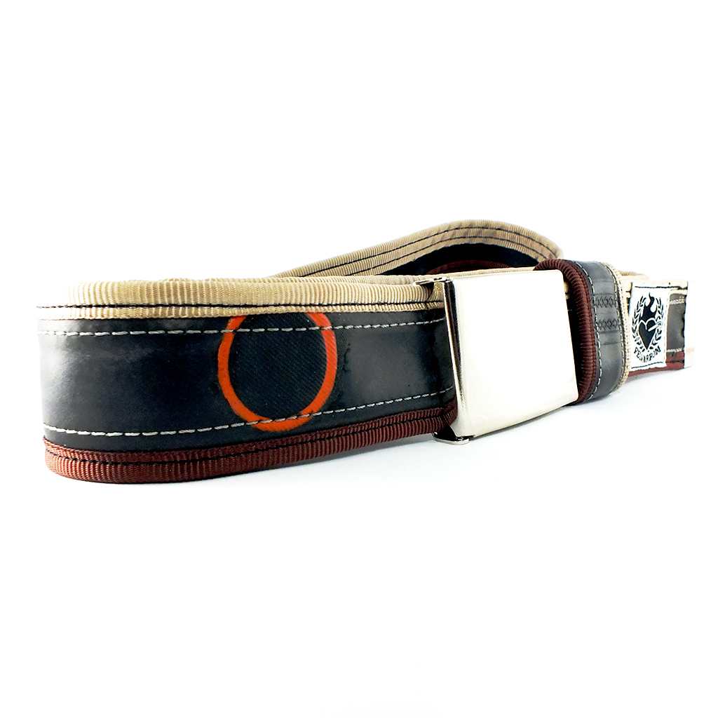 Čuvajte prirodu! Remen izrađen od pomno odabranih, visokokvalitetnih, recikliranih zračnica, s raznobojnim platnenim trakama sašivenim sa strane. Svaki remen ima biciklističku zakrpu na površini, nastalu u prošlom životu te zračnice, pa ga to čini različitim i jedinstvenim. Pored iznimne izdržljivosti, ovi pojasevi vrlo su mekani i ne rastežu se. Sve zračnice koje su prikupljene detaljno se čiste, pa ne morate brinuti da će vam ovaj remen obojiti hlače. Snažna flip-top metalna kopča je podesiva, ne treba rupe te ne oštećuje površinu zračnice.
