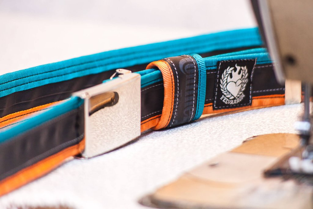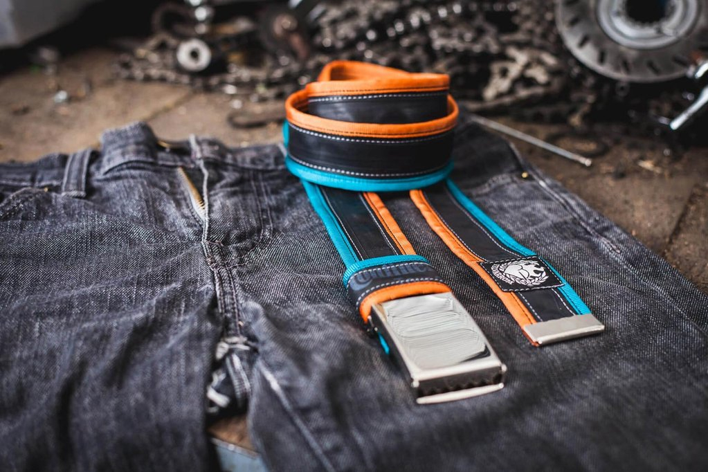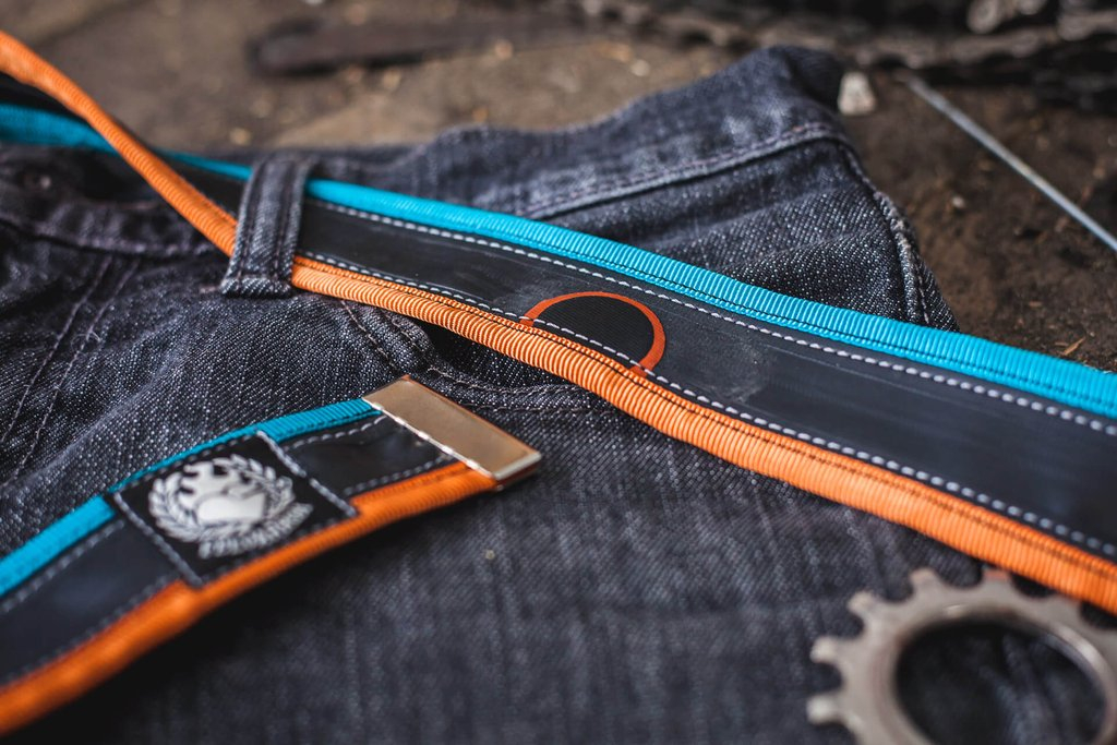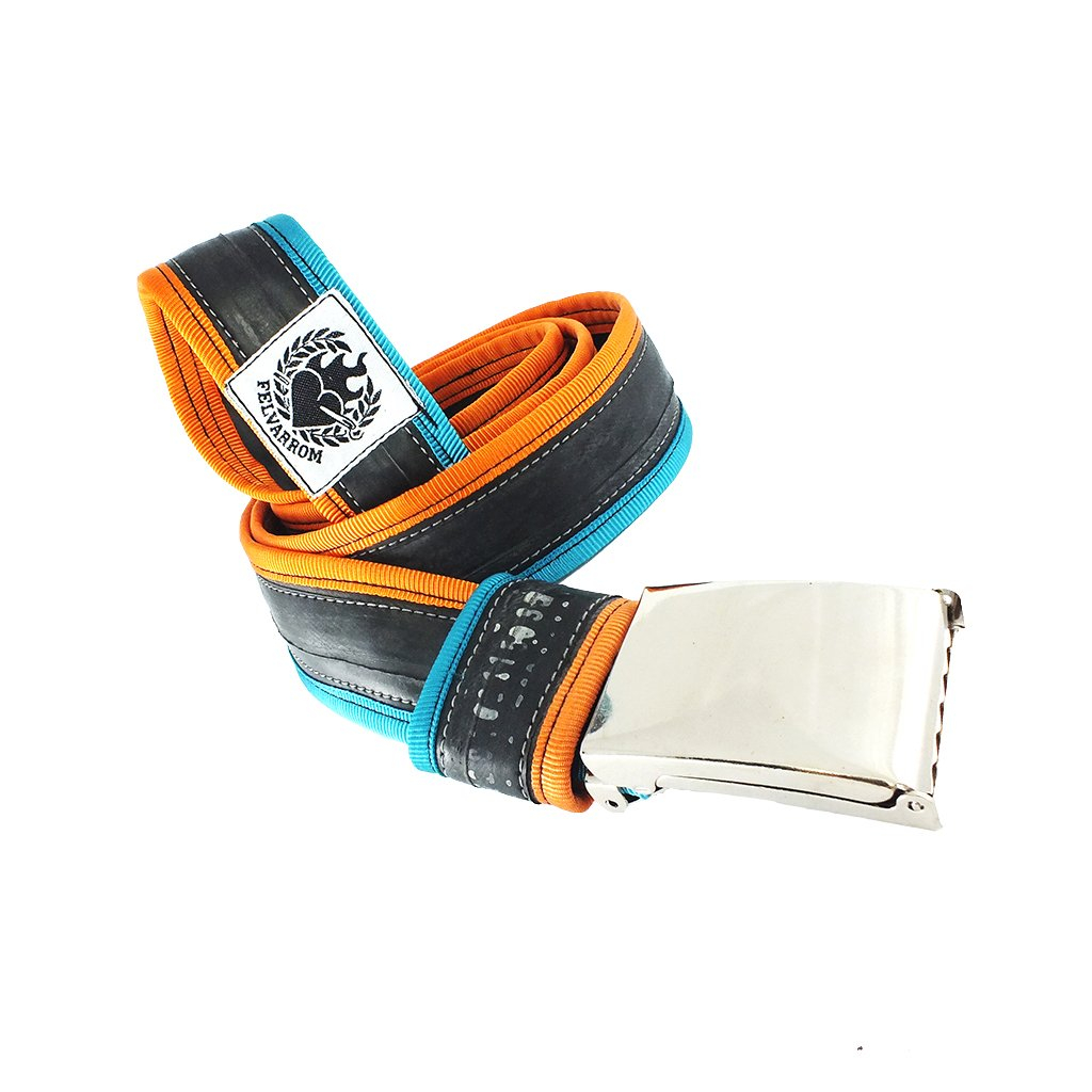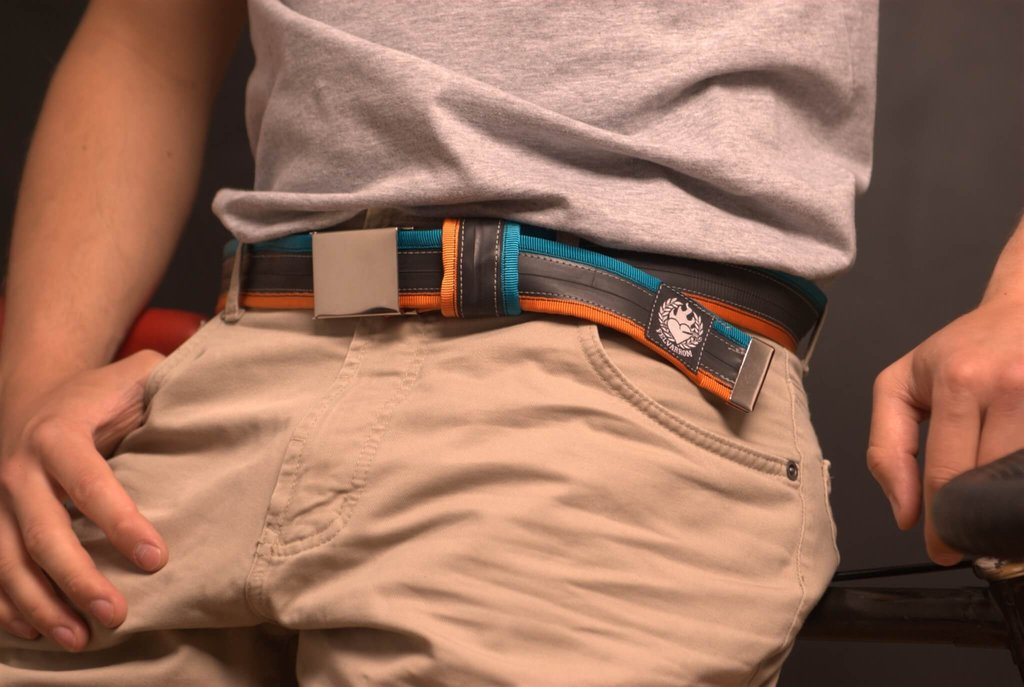 Čuvajte prirodu! Remen izrađen od pomno odabranih, visokokvalitetnih, recikliranih zračnica, s raznobojnim platnenim trakama sašivenim sa strane. Svaki remen ima biciklističku zakrpu na površini, nastalu u prošlom životu te zračnice, pa ga to čini različitim i jedinstvenim. Pored iznimne izdržljivosti, ovi pojasevi vrlo su mekani i ne rastežu se. Sve zračnice koje su prikupljene detaljno se čiste, pa ne morate brinuti da će vam ovaj remen obojiti hlače. Snažna flip-top metalna kopča je podesiva, ne treba rupe te ne oštećuje površinu zračnice.