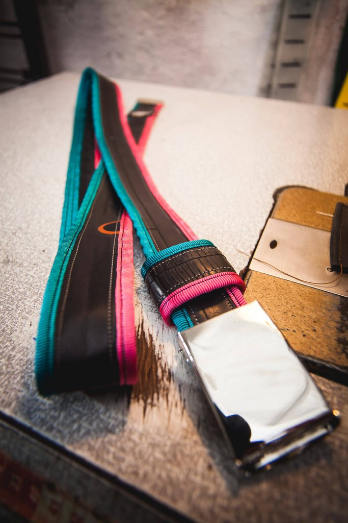 Čuvajte prirodu! Remen izrađen od pomno odabranih, visokokvalitetnih, recikliranih zračnica, s raznobojnim platnenim trakama sašivenim sa strane. Svaki remen ima biciklističku zakrpu na površini, nastalu u prošlom životu te zračnice, pa ga to čini različitim i jedinstvenim. Pored iznimne izdržljivosti, ovi pojasevi vrlo su mekani i ne rastežu se. Sve zračnice koje su prikupljene detaljno se čiste, pa ne morate brinuti da će vam ovaj remen obojiti hlače. Snažna flip-top metalna kopča je podesiva, ne treba rupe te ne oštećuje površinu zračnice.