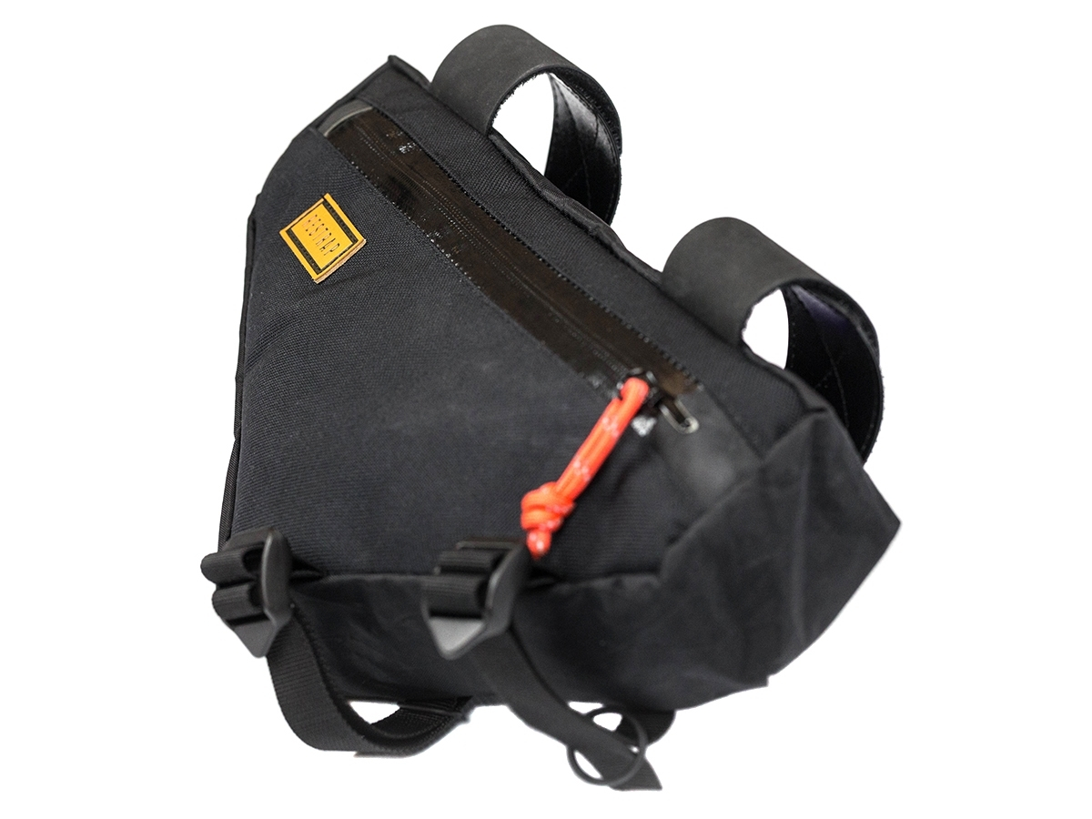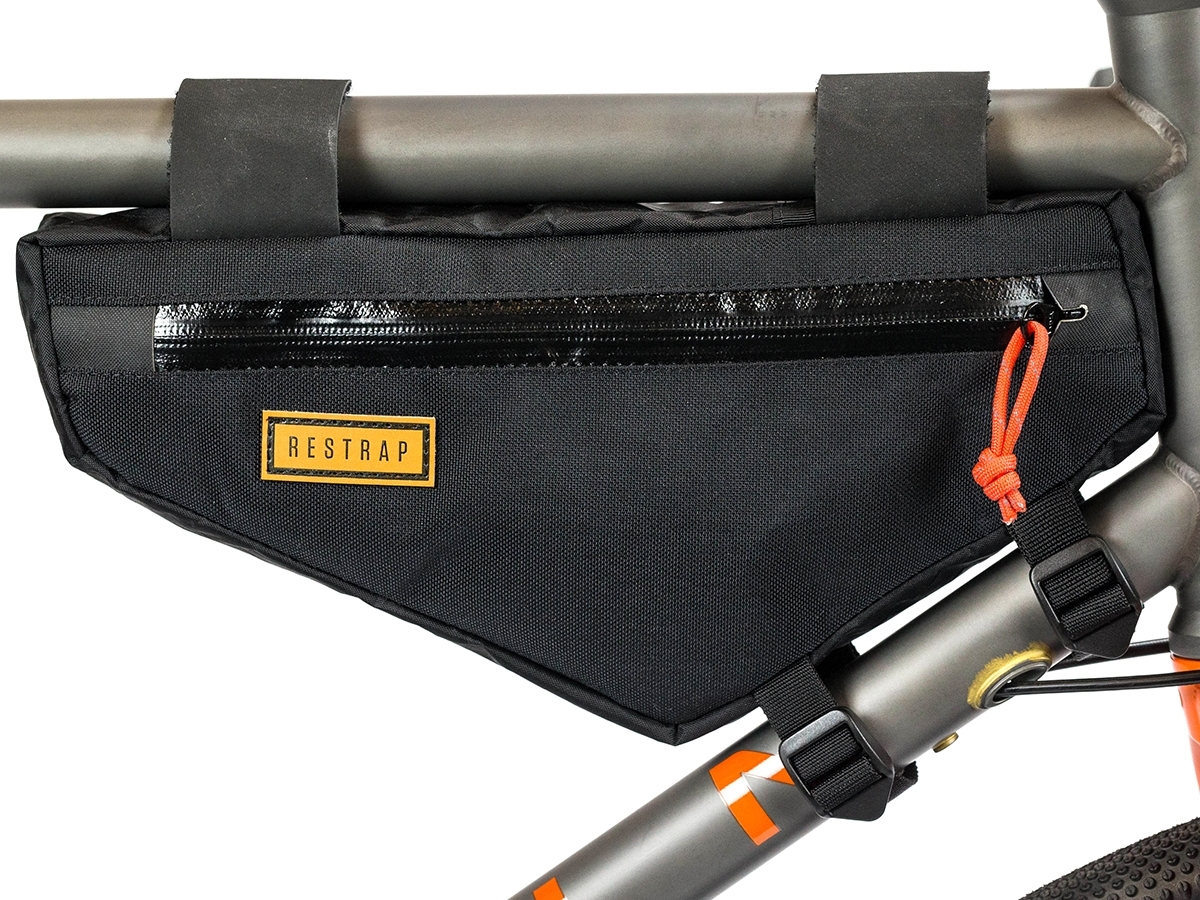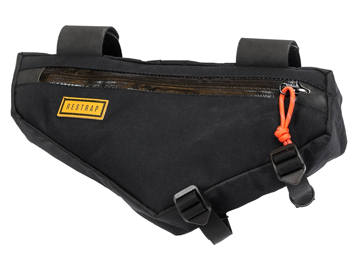 Potpuno vodootporni patentni zatvarači, vanjska strana od 1000D cordure i VX21 tkanine, sve Restrap torbe za okvir bicikla čuvat će vaše stvari sigurnima i suhima u najgorim vremenskim uvjetima. Gumirani remen pruža sigurno prianjanje na okvir, a reflektirajući ‘’paracord’’ patent zatvarači daju dodatnu sigurnost. Unutarnji mrežasti džepovi održavaju vas organiziranim dok ste na cesti ili u šumi. Za dinamo svjetla predviđen je dodatni utor za efikasniju instalaciju kablova.
