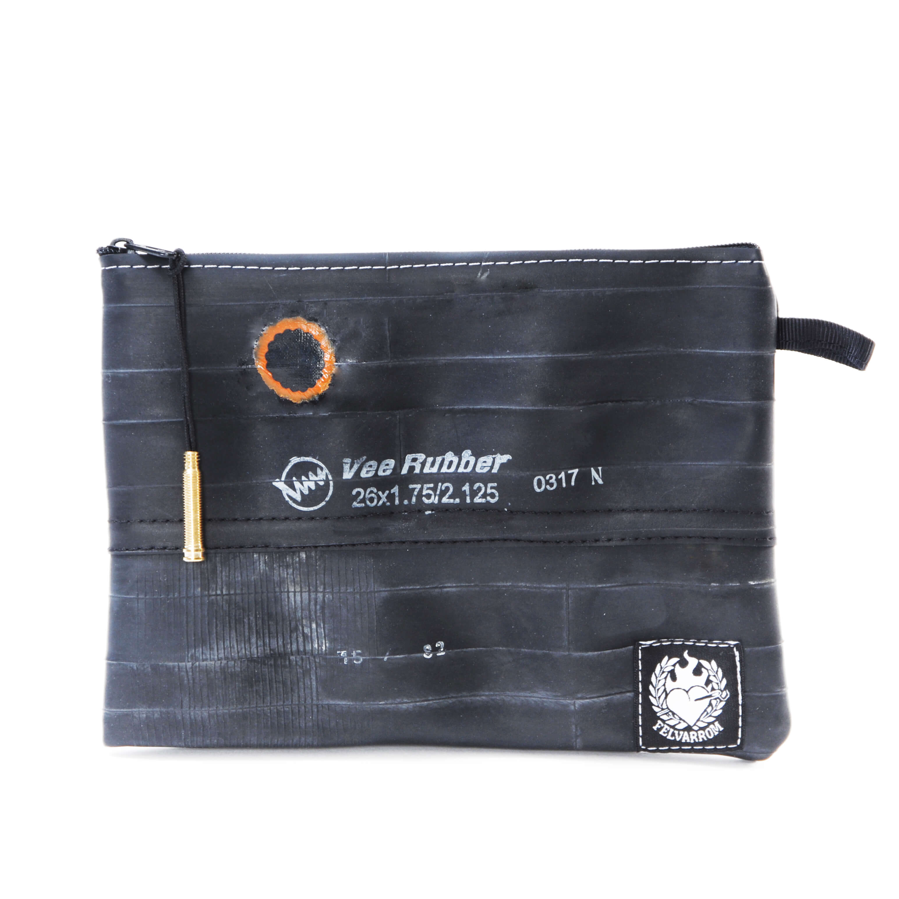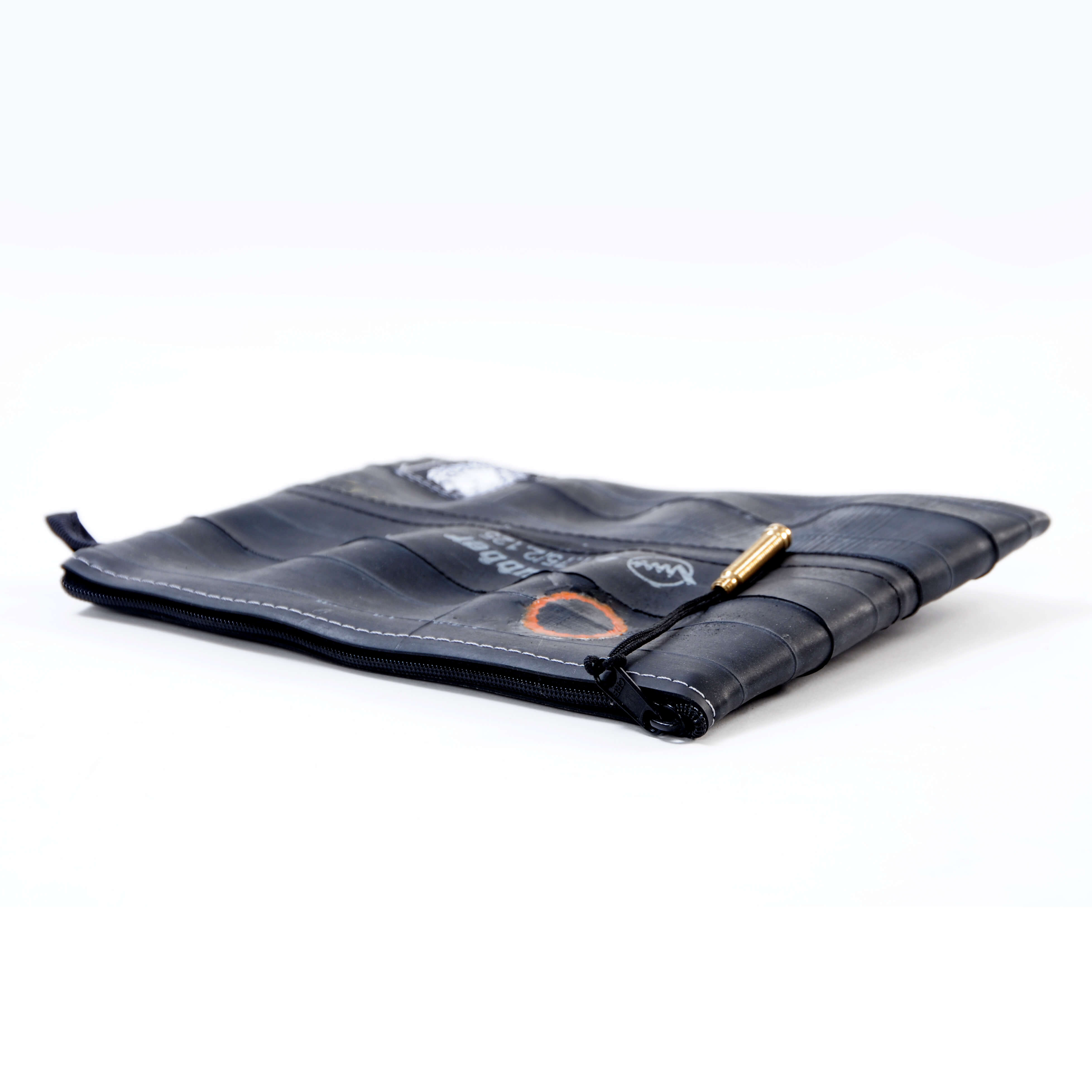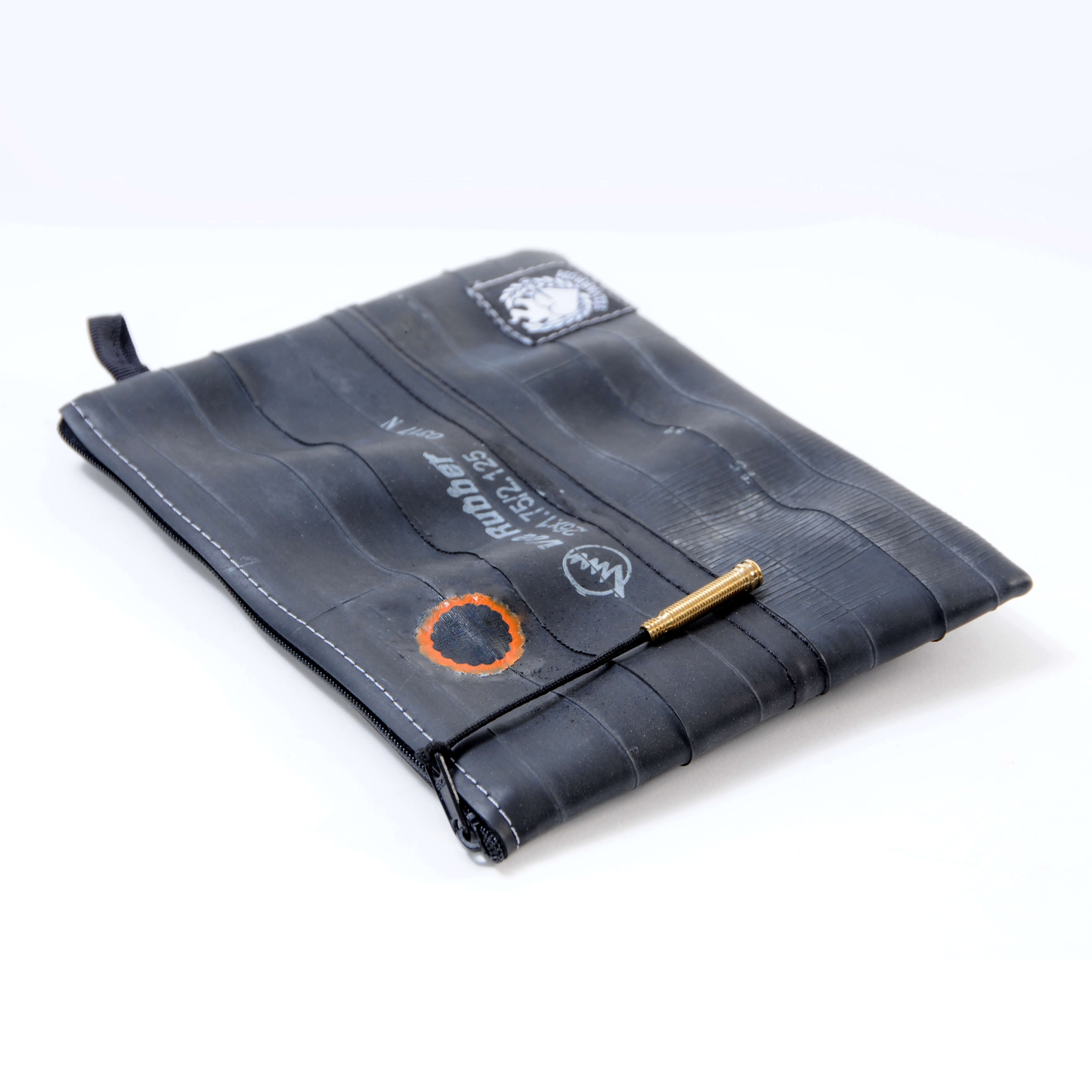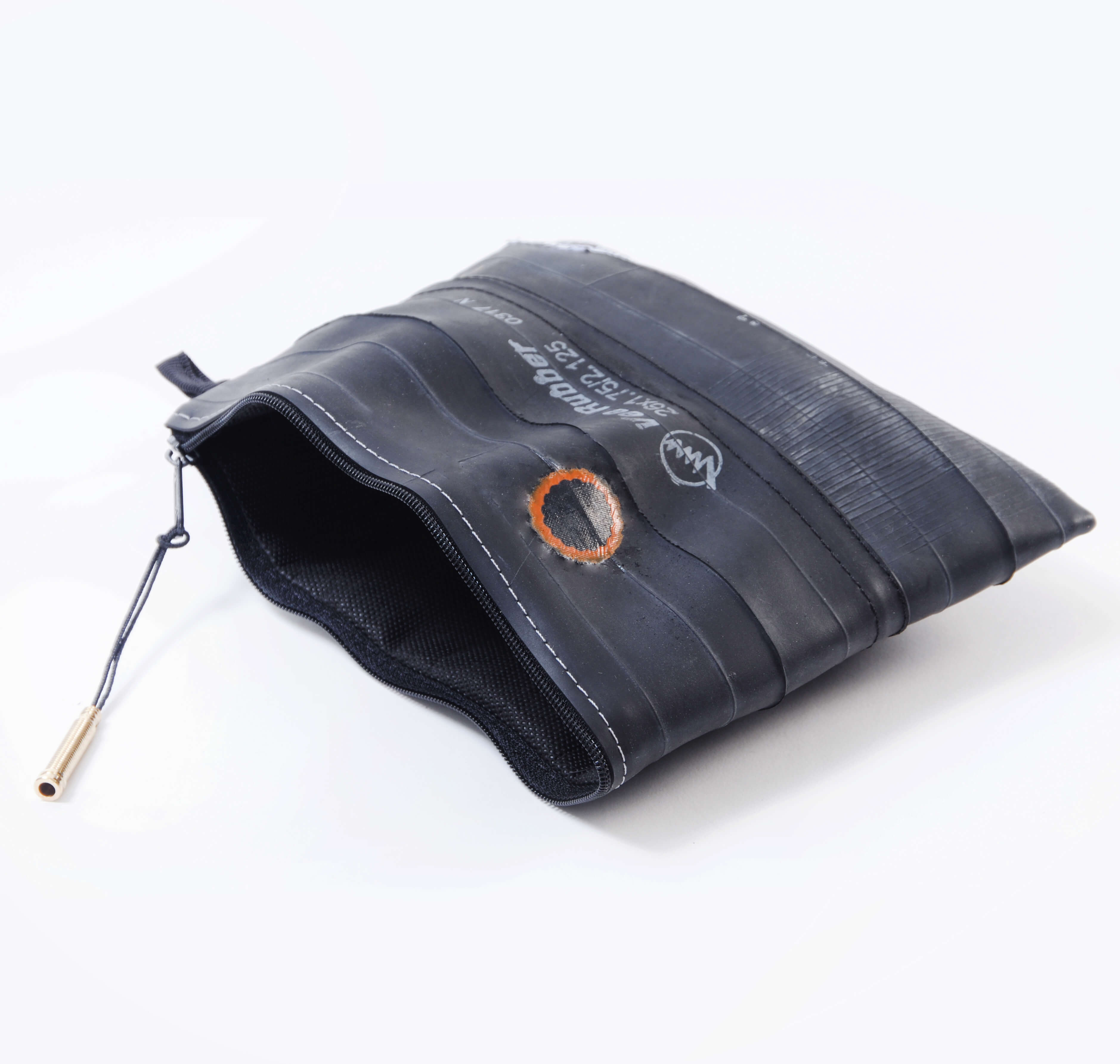 Čuvajte prirodu! Višenamjenska torbica ručno je izrađena od pažljivo odabranih, visokokvalitetnih recikliranih zračnica. Upotrebljiva je za šminku, putni pribor, punjač, duhan, a možda čak i putovnicu. Vi birate! Vanjska strana je pažljivo očišćena zračnica bicikla, pa se ne morate brinuti da će vam torbica ostaviti mrlje na odjeći. Unutarnja strana je meka, lagana tkanina crne boje. Na površini reciklirane zračnice pronaći ćete biciklističke zakrpe nastale u prošlom životu te zračnice. Vrh patentnog zatvarača je reciklirani ventil zračnice, a patentni zatvarač je metalni.