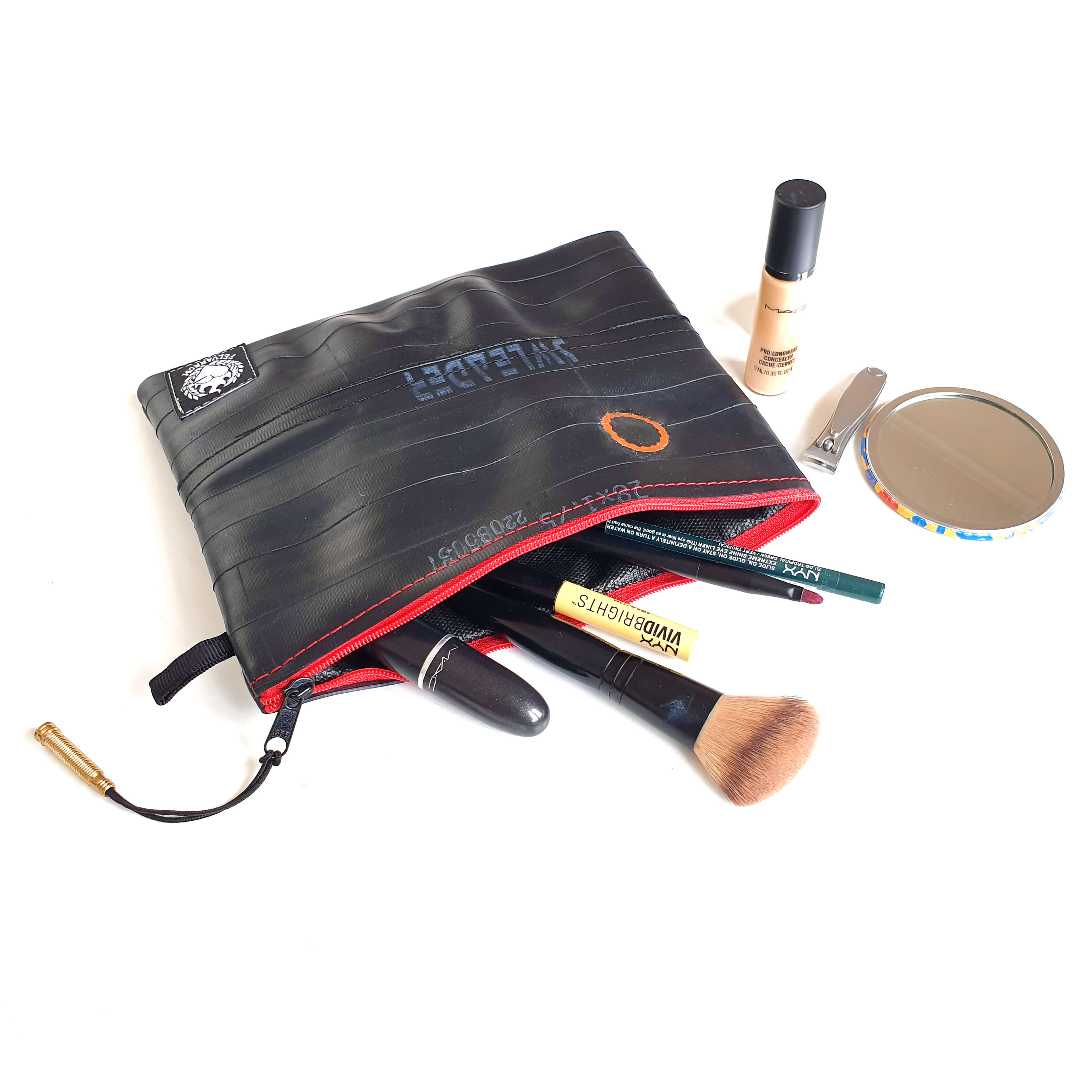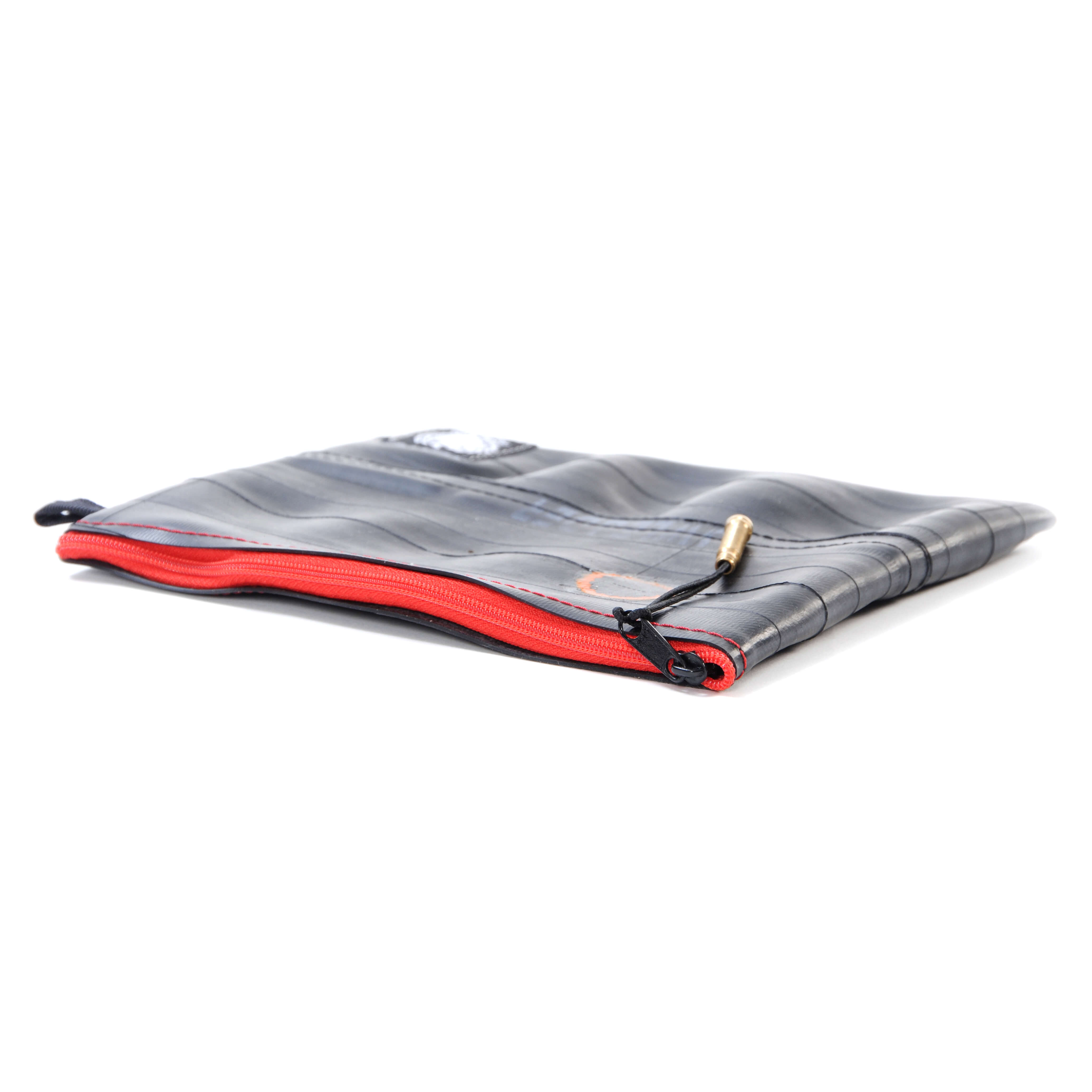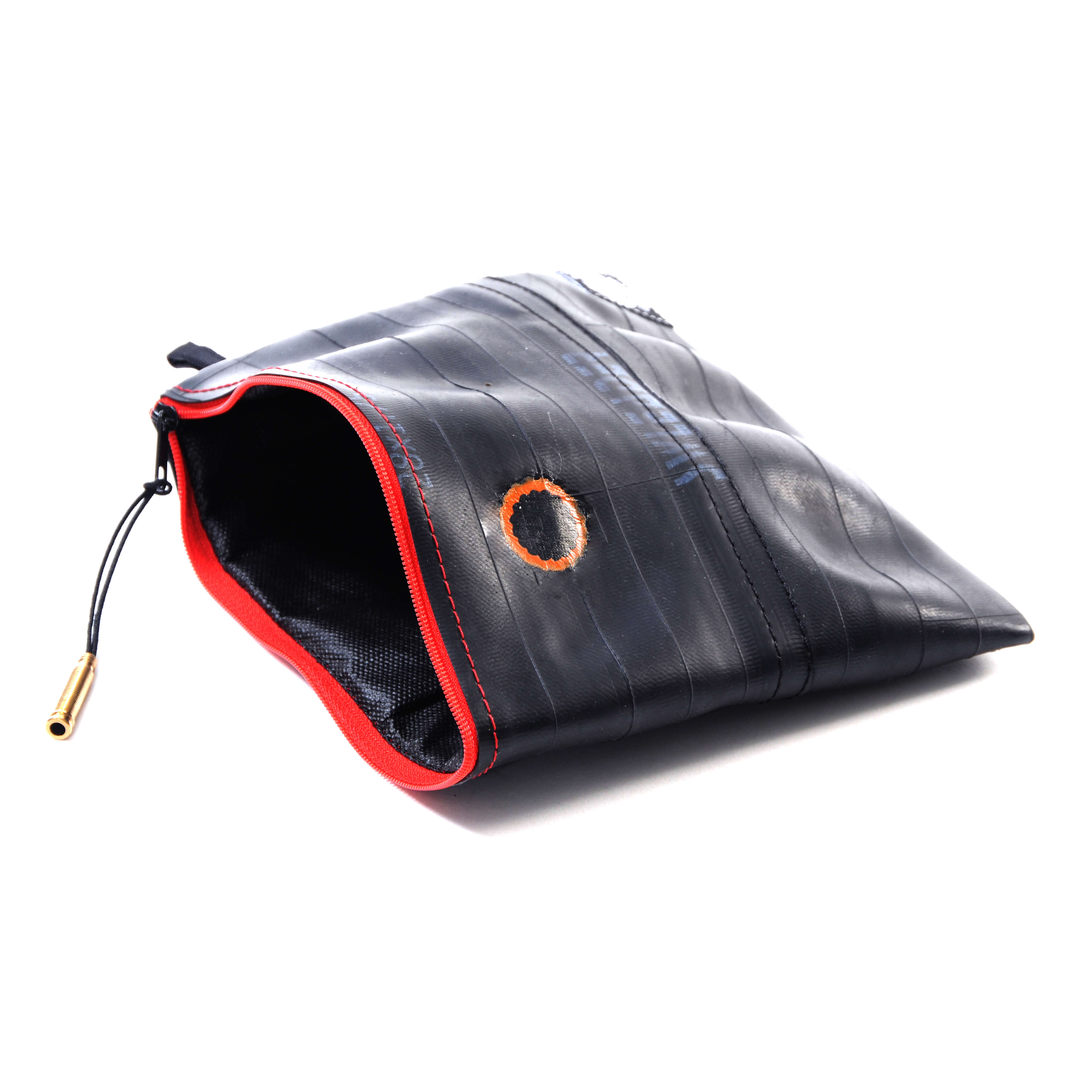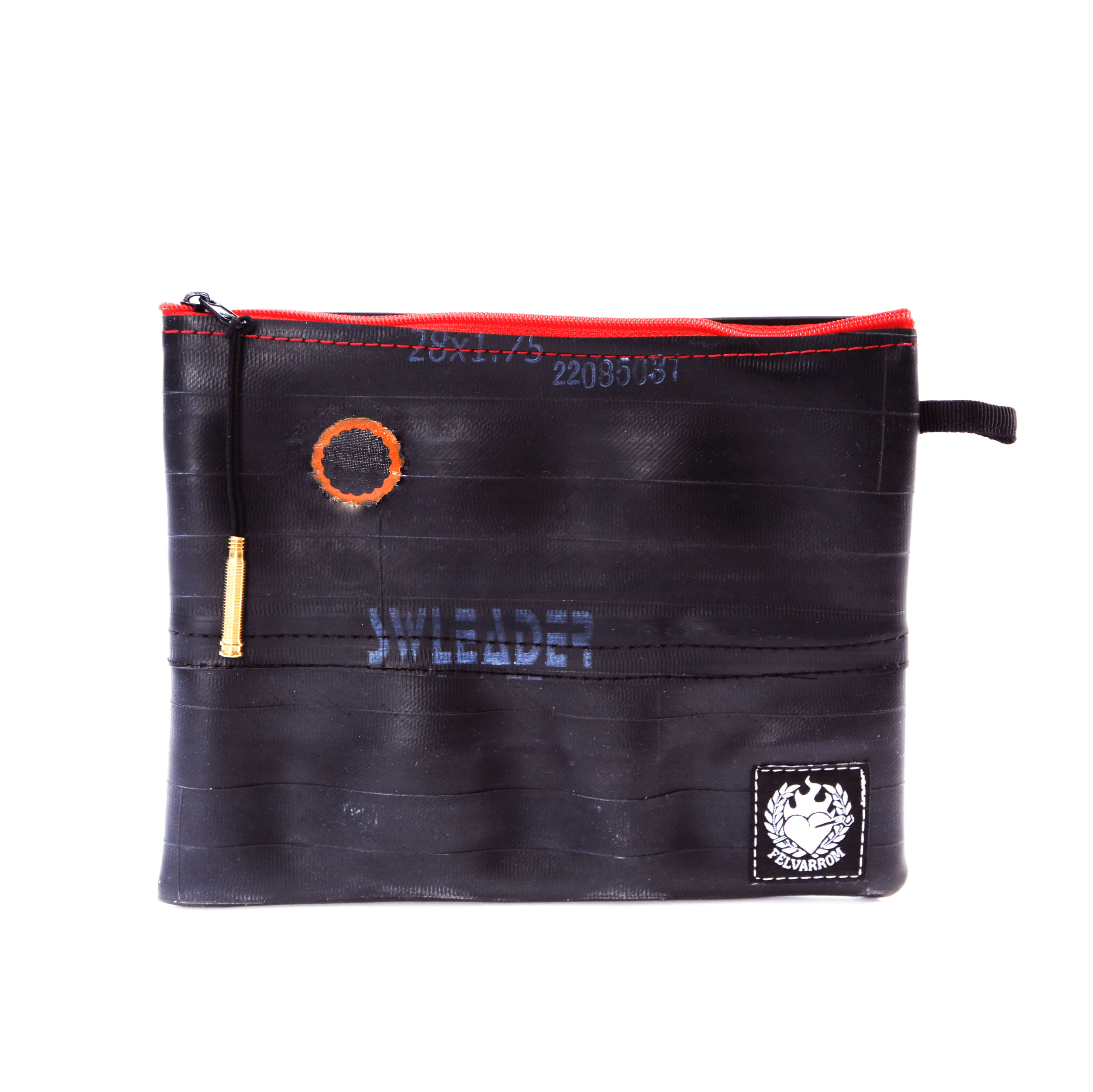 Čuvajte prirodu! Višenamjenska torbica ručno je izrađena od pažljivo odabranih, visokokvalitetnih recikliranih zračnica. Upotrebljiva je za šminku, putni pribor, punjač, duhan, a možda čak i putovnicu. Vi birate! Vanjska strana je pažljivo očišćena zračnica bicikla, pa se ne morate brinuti da će vam torbica ostaviti mrlje na odjeći. Unutarnja strana je meka, lagana tkanina crne boje. Na površini reciklirane zračnice pronaći ćete biciklističke zakrpe nastale u prošlom životu te zračnice. Vrh patentnog zatvarača je reciklirani ventil zračnice, a patentni zatvarač je metalni.