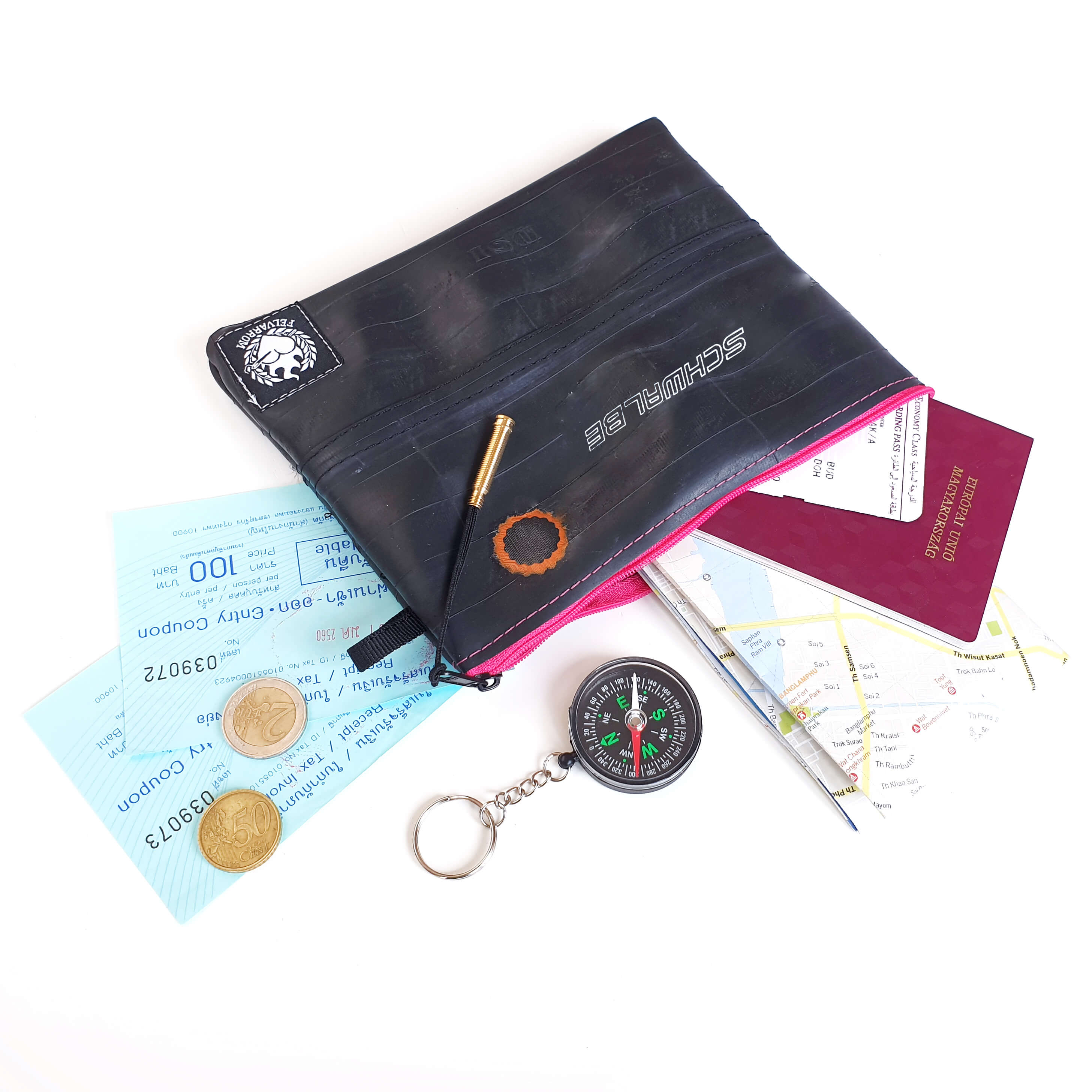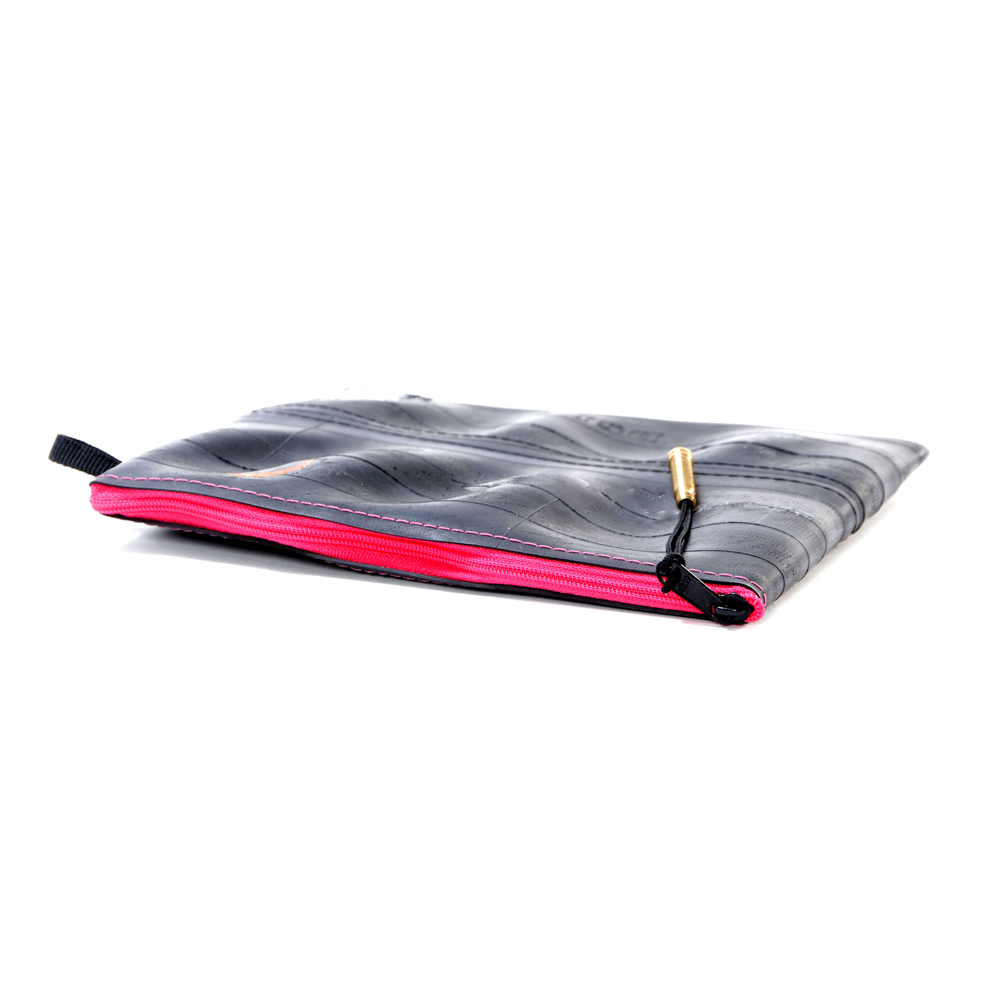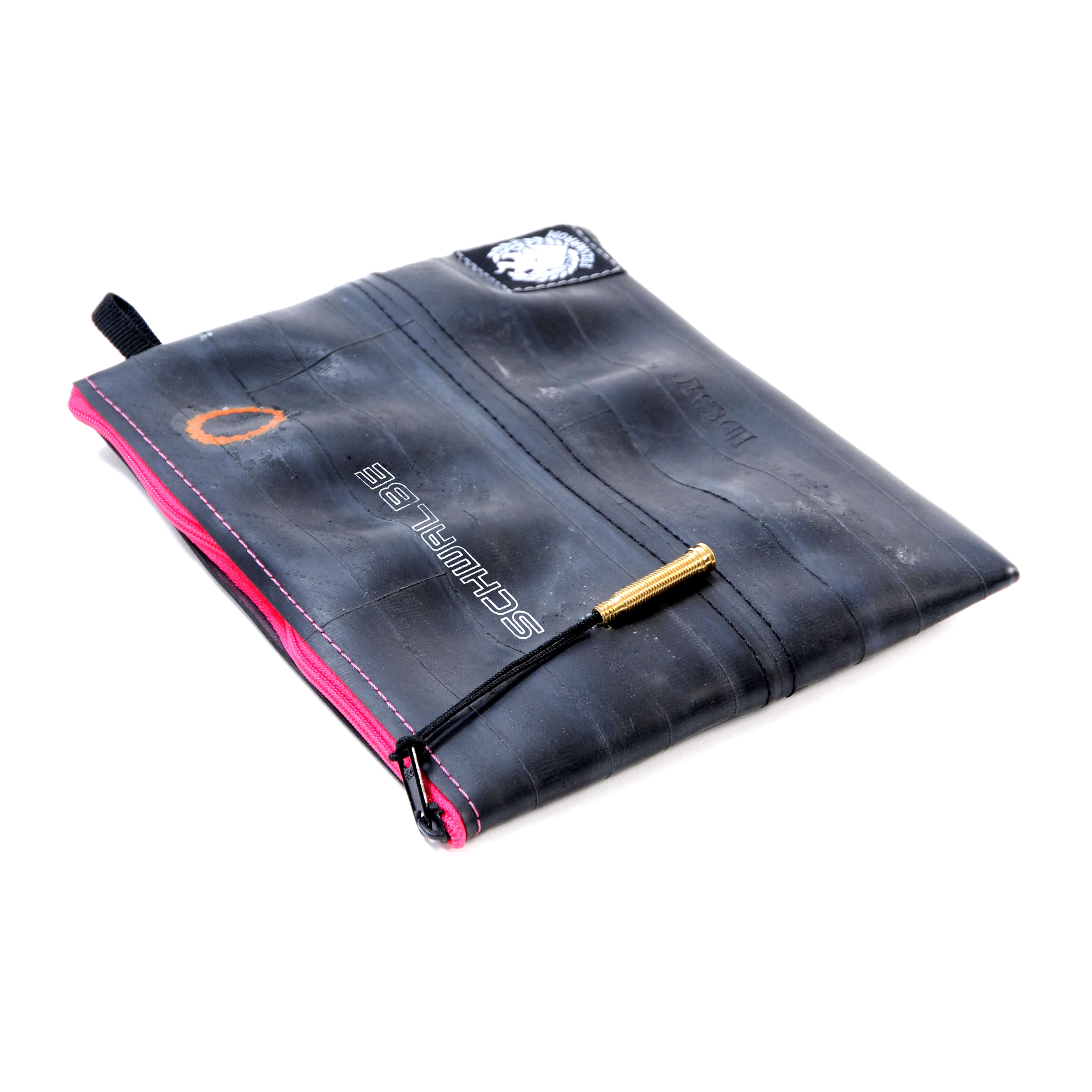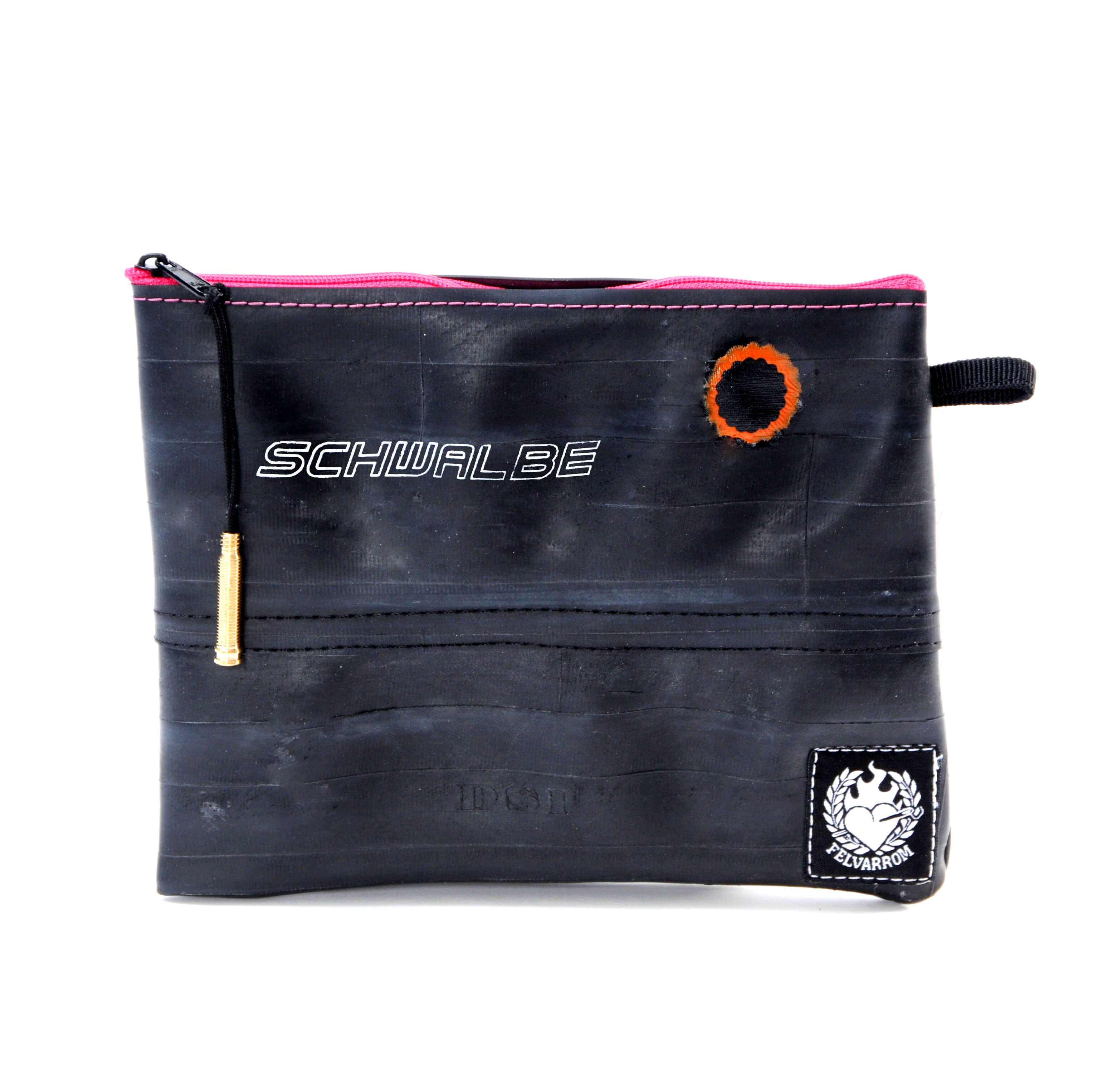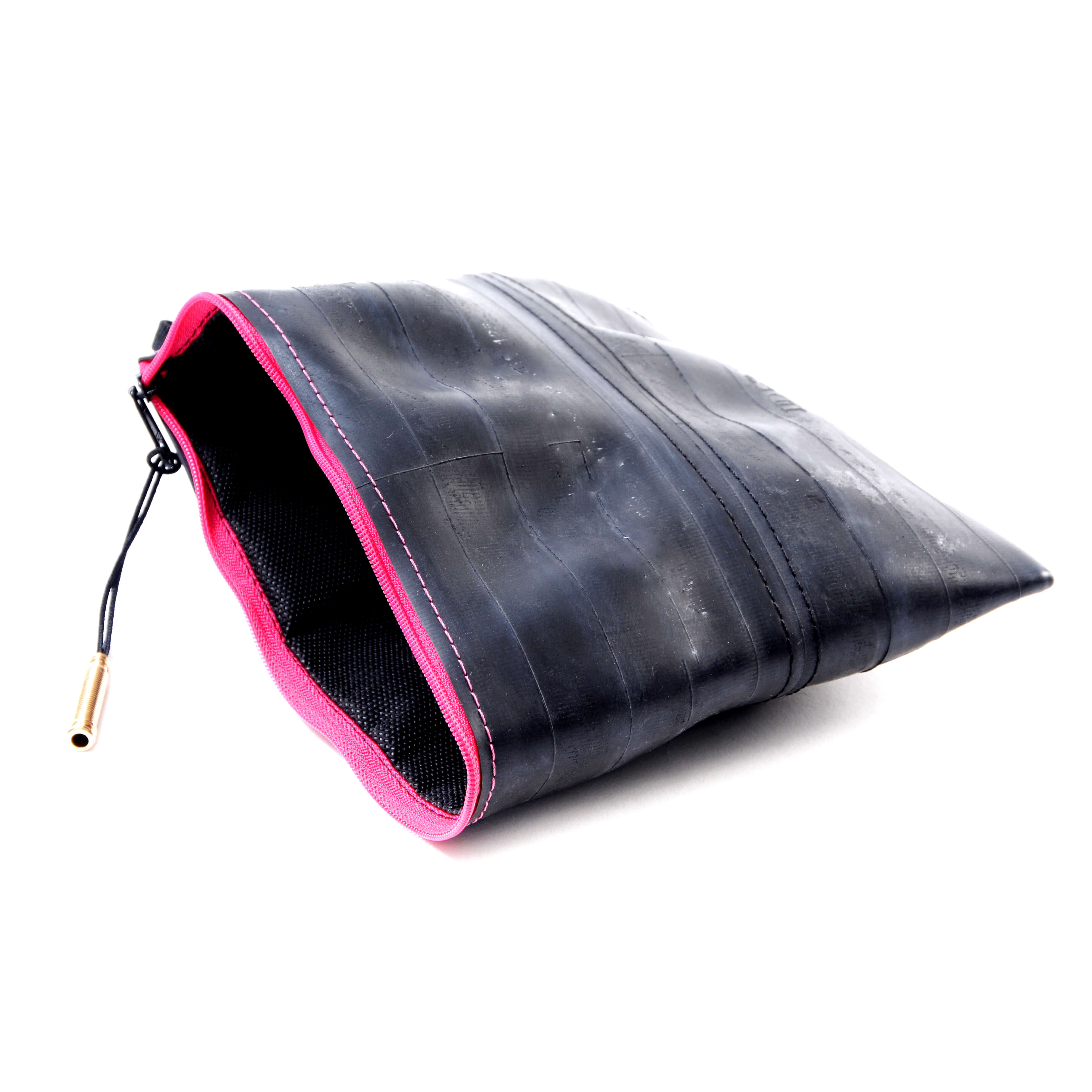 Čuvajte prirodu! Višenamjenska torbica ručno je izrađena od pažljivo odabranih, visokokvalitetnih recikliranih zračnica. Upotrebljiva je za šminku, putni pribor, punjač, duhan, a možda čak i putovnicu. Vi birate! Vanjska strana je pažljivo očišćena zračnica bicikla, pa se ne morate brinuti da će vam torbica ostaviti mrlje na odjeći. Unutarnja strana je meka, lagana tkanina crne boje. Na površini reciklirane zračnice pronaći ćete biciklističke zakrpe nastale u prošlom životu te zračnice. Vrh patentnog zatvarača je reciklirani ventil zračnice, a patentni zatvarač je metalni.